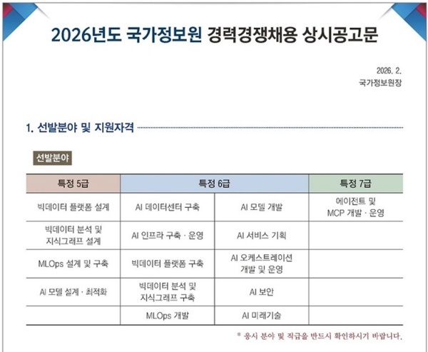 국가정보원(원장 이종석, 이하 국정원)에 따르면 2026년 2월 인공지능(AI) 분야 전문 경력직 관련 채용설명회를 2월12일(목), 25일(수), 27(금) 19시에 각 3회 실시한다.
