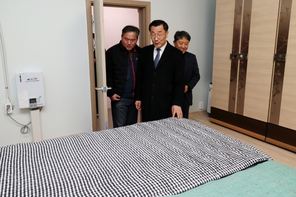 ▲ 한국국토정보공사 어명소 사장과 LX노동조합 위경열 위원장, 선덕보육원 성제환 원장이 생활관에 설치된 개인용 침대를 살펴보고 있다 [출처=한국국토정보공사]