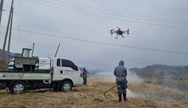 ▲ 농협 강원본부 및 원주축협 공동방제단이 10일 원주천 철새도래지에서 드론과 방역차량을 활용해 축산농가 주변을 정밀 소독하고 있다 [출처=농협경제지주]