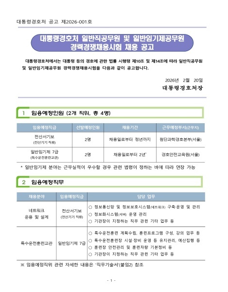 [대통령 경호처 채용 정보] 대통령경호처 일반직공무원 및 일반임기제공무원 경력경쟁채용시험 채용 공고(2026.02.26.(목) ~ 2026.03.03.(화), 18시까지)