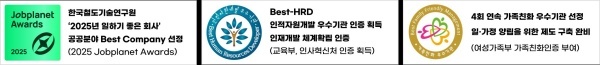 ▲ 조직문화협의회에서 우수 조직문화기관상 수상, 교육부와 인사혁신처에서 Best-HRD 인증 획득 [출처=한국촐도기술연구원]