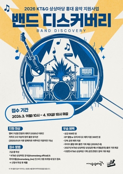 KT&G(사장 방경만)에 따르면 2026년 4월10일까지 KT&G 상상마당이 인디 뮤지션 발굴을 위한 음악 지원 프로그램 ‘2026 밴드 디스커버리’ 참가자를 모집한다.