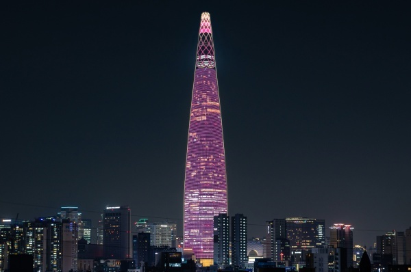▲ 벚꽃색으로 물드는 롯데월드타워 [출처=롯데물산]