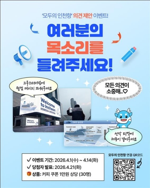 인천항만공사(사장 이경규)에 따르면 2026년 4월1일(수)부터 국민이 항만운영 정책 과정에 직접 참여할 수 있는 인천항만공사 국민소통플랫폼 「모두의 인천항」 활성화를 위한 대국민 참여 이벤트를 실시한다.
