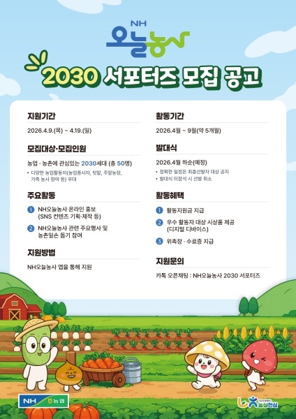 최한호 디지털전략부장은 “이번 「NH오늘농사 2030 서포터즈」는 청년 세대와 함께 농업의 가치를 공유하고 디지털 농업 확산을 이끄는 계기가 될 것이다”며 “열정과 창의성을 갖춘 청년들의 많은 참여를 기대한다”고 밝혔다.