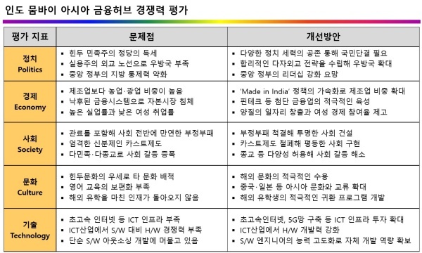 국가정보전략연구소(국정연)가 지방자치단체의 행정·선거공약을 평가하기 위해 개발한 ‘오곡(五穀)밸리혁신(5G Valley Innovation)’ 모델을 적용해 뭄바이의 아시아 금융허브 경쟁력을 정치·경제·사회·문화·기술 측면에서 평가했다.