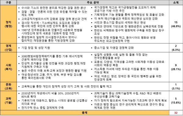 공약은 정치(행정)(15)·경제(산업)(2)·사회(복지)(9)·문화(교육)(1)·과학(기술)(5) 등으로 구성됐으며 정치(행정) 공약이 전체의 46.9%를 차지했다. 다음으로 △사회(복지) 공약 28.1% △과학(기술) 공약 15.6% △경제(산업) 공약 6.3% △문화(교육) 공약 3.1%를 각각 기록했다. 요소별 주요 공약은 다음과 같다.