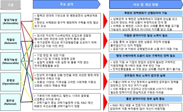 적절성은 공약이 국가의 다양한 여건에 적합한지 평가하는 지표이며 검사장 직선제∙기소배심제도 도입으로 검찰권 행사에 대한 국민에 의한 민주적 통제 강화, 국가경쟁력 제고와 국가균형발전을 도모하기 위해 공공기관 지방 이전 추진을 분석했다.
