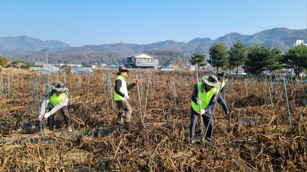 ▲ 디지털경제부 직원들은 10월31일 인천 강화 관내 농가에서 포도밭 비닐 정리 작업을 실시했다 [출처=농협경제지주]