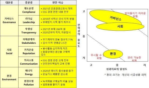 △거버넌스(Governance·지배구조)=노사 공동으로 인권경영 선언문을 채택했으나 ESG 경영과 관련된 어떤 행사나 제도도 정비하지 않아 개선의 여지가 크다. 부패방지 시책 평가에서 최우수 등급을 받은 것은 긍정적이지만 적자를 감안하면 부채가 너무 많아 경영혁신이 필요하다.
