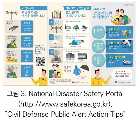 또한 우리나라와 북한의 지리적 위치를 고려했을 때 북한의 미사일은 발사 후 3∼5분 내에 우리 영토에 낙하하므로 발사 후 징후 탐지와 조기경보에 의한 주민 대피가 핵 공격에 대한 방호의 핵심적인 요소라고 볼 수 있다.