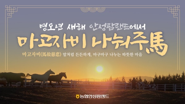 농협중앙회(회장 강호동)에 따르면 농협경제지주 안성팜랜드(분사장 강민경)가 병오(丙午)년 말(馬)의 해를 맞아 2026년 1월1일(목)부터 안성팜랜드에서 말 체험을 중심으로 다양한 참여형 프로그램을 운영하는 「마고자비 나눠주마(馬)」테마 이벤트를 진행한다.