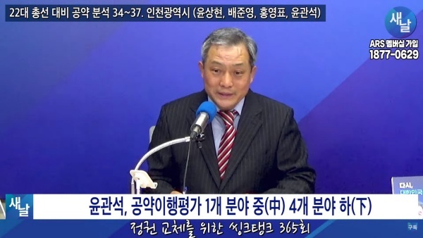 2024년01월16일(화요일) 새날 유튜브 방송은 2020년 21대 국회의원 선거에서 당선된 인천광역시 남동구을 윤관석 의원이 제시한 선거공약을 평가했다. 평가를 위한 방송에는 푸른나무, 이상구 원장, 민진규 소장(국가정보전략연구소)이 출연했다.