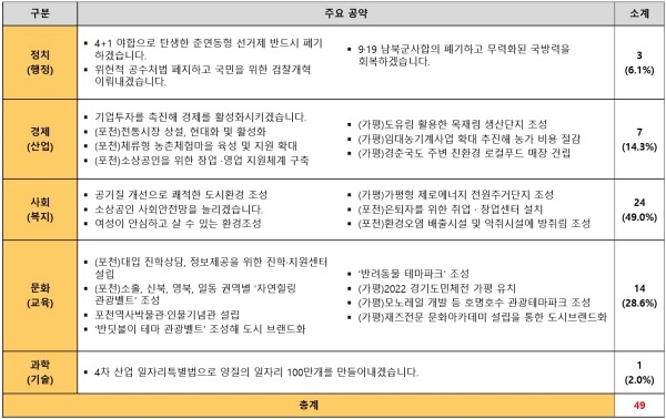 49개 공약은 정치행정(3)·경제산업(7)·사회복지(24)·문화교육(14)·과학기술(1)로 구성