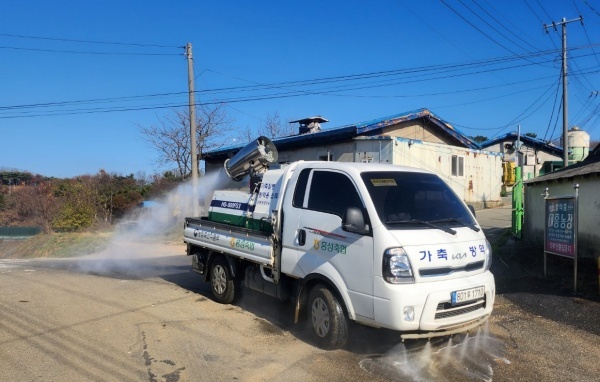 ▲ 홍성축협 공동방제단 방역차량이 광역소독을 하고 있다 [출처=농협경제지주]