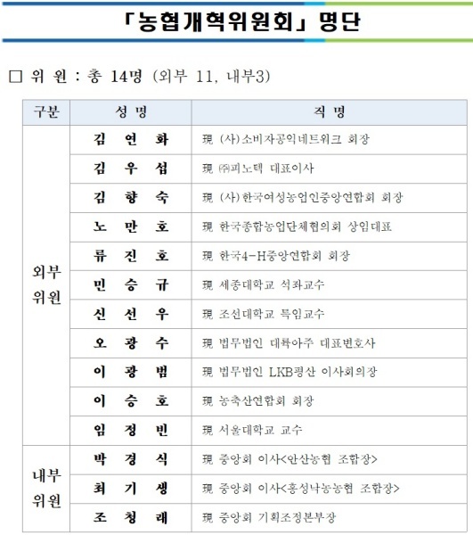 ▲ 농협중앙회, 농협개혁위원회 명단 [출처=농협중앙회]