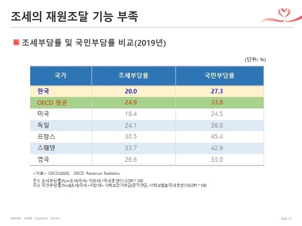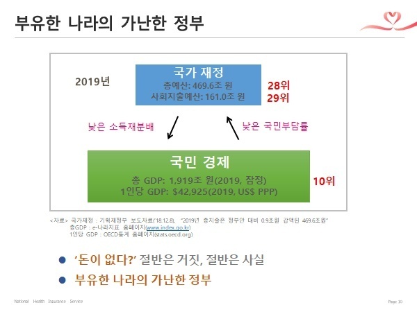 - 지표를 보면 GDP는 크나 국가재정이 적습니다. “부유한 나라의 가난한 정부‘라고 볼 수 있습니다. 한국 정부는 적게 걷어, 적게 쓰고 있습니다