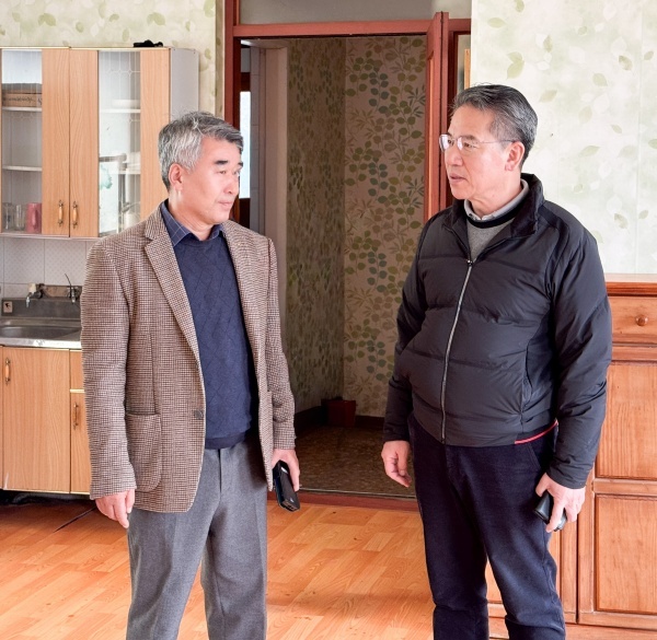 ▲ 2월13일(금) 경기 안성시 고삼농협 공공형 계절근로사업 운영 현황을 점검하기 위해 박서홍 농협중앙회 부회장(사진 오른쪽)과 윤홍선 고삼농협 조합장(사진 왼쪽)이 근로자 숙소의 생활 여건을 살펴보고 있다 [출처=농협중앙회]