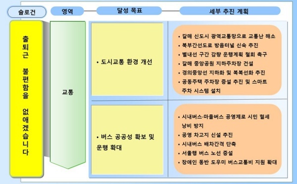 우선 도시교통 환경 개선은 △갈매 신도시 광역교통망으로 교통난 해소 △북부간선도로 방음터널 신속 추진 △별내선 구간 감량 운행계획 철회 촉구 △갈매 중앙공원 지하주차장 건설 △경의중앙선 지하화 및 복복선화 추진 △공동주택 주차장 증설 추진 및 스마트 주차 시스템 설치 등으로 완성하겠다는 구상이다.