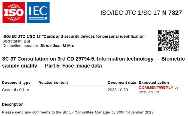 2023년 10월25일 ISO/IEC 공동기술위원회 산하 분과위원회 SC 17은 'SC 37 Consultation on 3rd CD 29794-5, Information technology — Biometric sample quality — Part 5- Face image data' 관련된 문서를 배포했다.