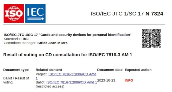 지난 10월23일 ISO/IEC 공동기술위원회 산하 분과위원회 SC 17은 'Result of voting on CD consultation for ISO/IEC 7816-3 AM 1' 관련된 문서를 배포했다.