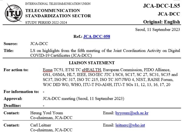 'LS on highlights from the fifth meeting of the Joint Coordination Activity on Digital COVID-19 Certificates (JCA-DCC)' 문서는 디지털 코로나 19 인증서에 관한 공동 조정활동(Joint Coordination Activity on Digital COVID-19 Certificates, JCA-DCC)의 다 섯번째 주요 회의 내용이 포함됐다.