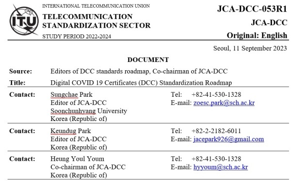 배포된 'Liaison statement from ITU-T JCA on Digital Covid Certificates'와 관련된 문서는 'Digital COVID 19 Certificates (DCC) Standardization Roadmap'과 'LS on highlights from the fifth meeting of the Joint Coordination Activity on Digital COVID-19 Certificates (JCA-DCC)' 등 2개다.