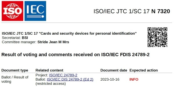 지난 10월16일 ISO/IEC 공동기술위원회 산하 분과위원회 SC 17은 'Result of voting and comments received on ISO/IEC FDIS 24789-2' 관련된 문서를 배포했다.