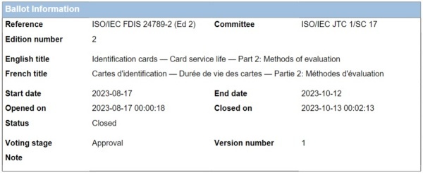 ISO/IEC 24789-2 표준 프로젝트로 'ISO/IEC FDIS 24789-2 (Ed 2) Identification cards — Card service life — Part 2: Methods of evaluation'에 대해 투표한 내용이다.