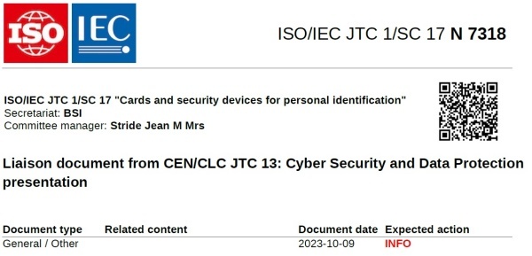 지난 10월16일 ISO/IEC 공동기술위원회 산하 분과위원회 SC 17은 'Liaison document from CEN/CLC JTC 13: Cyber Security and Data Protection presentation' 관련 문서를 배포했다.
