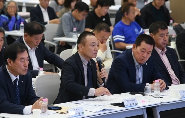 ▲ 4월24일 충북 청주 농협 충북본부에서 개최된 농림축산식품부 주관 농협법 개정 관련 권역별 설명회에서 참석 조합장이 발언하고 있다 [출처=농협중앙회]