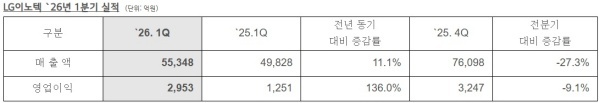▲ LG이노텍 `26년 1분기 실적(단위 : 억원) [출처=LG그룹]