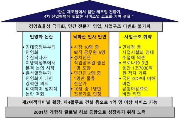 첫째, 인천국제공항은 국가 주요인프라에 속하므로 경영 효율성을 극대화해 민영화 논란부터 영원히 잠재워야 한다. 공기업의 민영화를 주장하는 사람들은 적자 운영 가능성과 신규 투자재원 확보를 이유로 든다.