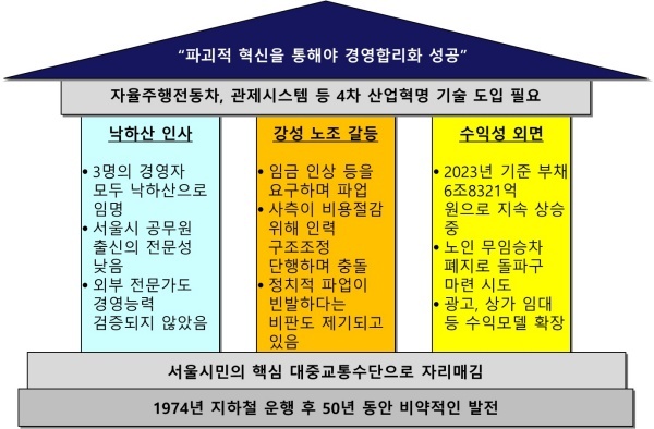 결론적으로 서울교통공사의 경영혁신은 낙하산 인사를 근절하고 기존 경영방식을 철저하게 부정하는 파괴적 혁신만이 해결책이라고 봐야 한다.