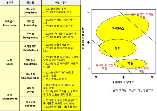 △거버넌스(Governance·지배구조)=거버넌스는 2023년 ESG 위원회를 구성하고 지속가능 경영보고서를 발간하고 있지만 ESG 헌장의 미제정, 이사회 내 여성 이사의 부재, ESG 경영 성과 미흡 등으로 개선이 시급한 것으로 평가했다.