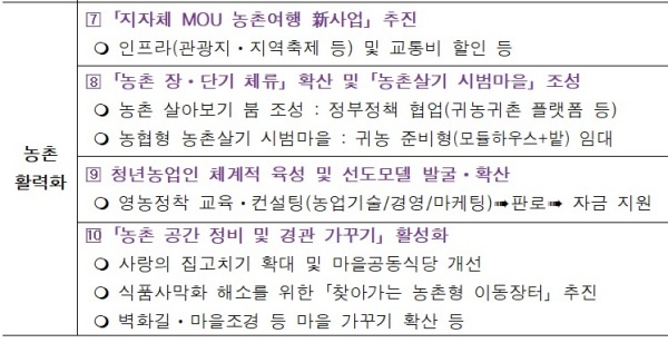 농협은 ‘농업인의 행복한 일터·삶터로 도시민이 찾아 오는 쉼터’로 농촌공간을 새롭게 만들어갈 계획이다. 지자체와 협력해 농촌체험 여행을 확대하고 지역축제 홍보 및 농촌방문 주간 운영을 통해 농촌지역 생활인구 증대에 기여한다.