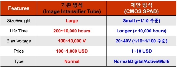 ▲ 기존 방식(Image Intensifier)과 제안 방식(CMOS SPAD)의 특성 비교 [출처=한국과학기술연구원]