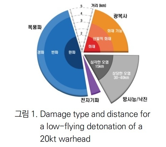 그림 1과 같이 폭발 원점 반경 3~4킬로미터(km) 이내에 집중적인 피해가 발생했다. 낙진은 30~40km에 도달한 것으로 보았을 때 핵 방호가 가능한 민방위 대피소의 구축이 필요한 것으로 평가할 수 있다.