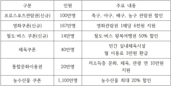 - 문화·예술·공연·체육·외식 등 코로나 피해가 극심했던 분야의 소비 증대를 위해 <6대 소비쿠폰과 바우처>를 추가 발행(2차 추경)하기로 했습니다.