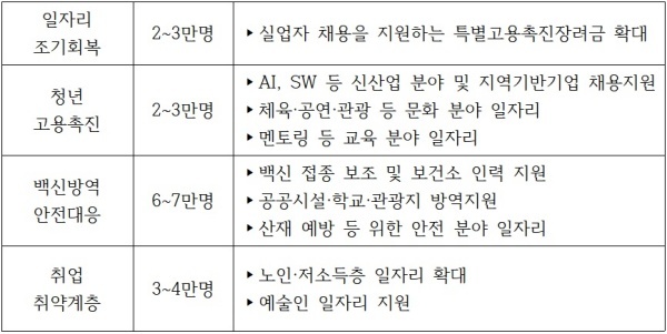 - 고용의 조기 정상화를 위해 4대 분야에서 15만 개 이상의 일자리를 추가로 창출할 수있도록 추경을 편성했다고 발표했습니다.