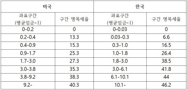 <표 3> 미국과 한국의 과표 구간과 구간별 명목세율 (2019년 기준)