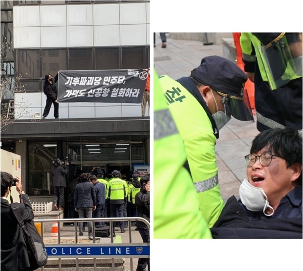 - 현재의 상황을 기후위기로 규정하고 기후위기에 대응하기 위해 지난해 7월 출범한 ‘멸종저항서울’ 회원 6명은 15일 오전 “가덕도 신공항법 밀어부친 민주당과 소속 정치인들을 규탄한다”며 이 같은 시위를 벌였습니다.
