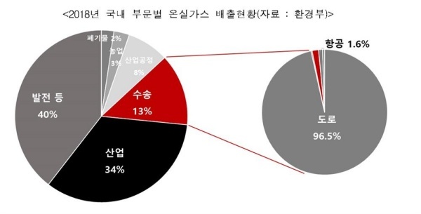 - 더불어민주당 2050탄소중립 실행위원장 김성환 의원(서울 노원병)이 오마이뉴스에 기고한 내용에 따르면 2018년 기준으로 우리나라 온실가스 총배출량은 7억 2,700만 톤인데, 그중 수송부문은 9,800만 톤으로 전체 배출량의 13.5%를 차지하고 있습니다.