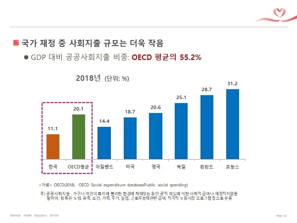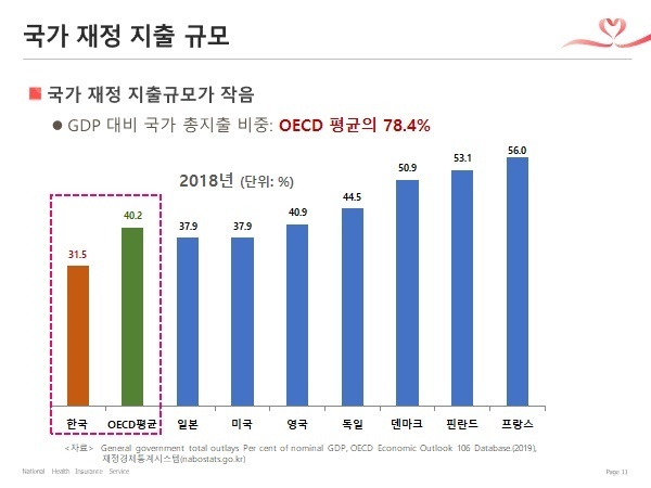 - 지표를 보면 GDP는 크나 국가재정이 적습니다. “부유한 나라의 가난한 정부‘라고 볼 수 있습니다. 한국 정부는 적게 걷어, 적게 쓰고 있습니다