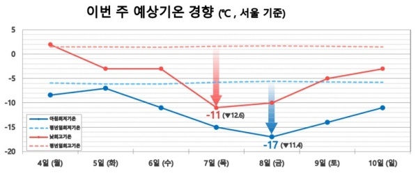 - 서울의 경우 7일(목) 아침 영하 15도, 8일(금)에는 영하 17도로 예상됩니다. 가끔 – 10° 이하로도 내려간 적이 있습니다만, 이번 목요일 같이 –17°, 체감온도는 – 20° 까지 내려 간 경우는 매우 적은 것 같습니다.