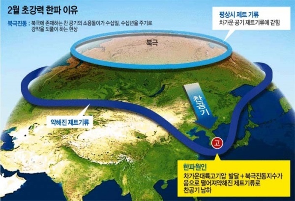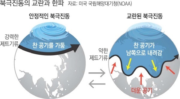 - 그런데 중위도 지역의 이런 이례적인 한파는 이들 ‘극 소용돌이(polar vortex)’에 몰려 있는 차가운 공기의 집합을 가두어 두고 있는 제트기류로 구성된 '북극진동'이 교란됐기 때문이라는 것입니다.