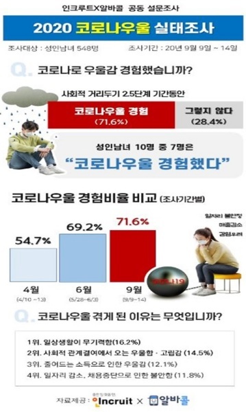 - 의학적으로 조사를 한 것은 아직 없지만, 여러 가지 설문조사 등을 통해 상당히 심각하다는 것이 드러나고 있습니다. 지난 21일 취업포털 인크루트와 알바콜이 올해 4월과 6월, 9월에 전국 성인남녀 총 5256명(누적 조사대상)을 대상으로 조사한 결과 '코로나 우울'을 경험했다는 응답은 각각 54.7%, 69.2%, 71.6%로 점점 증가하고 있는 것으로 나타났습니다.