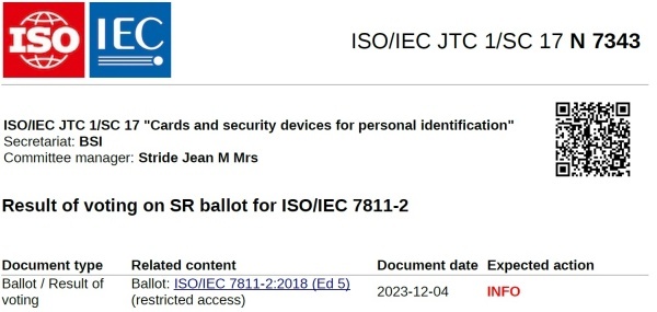 2023년 12월04일 ISO/IEC 공동기술위원회 산하 분과위원회 SC 17은 'Result of voting on SR ballot for ISO/IEC 7811-2(N 7343)' 문서를 배포했다.