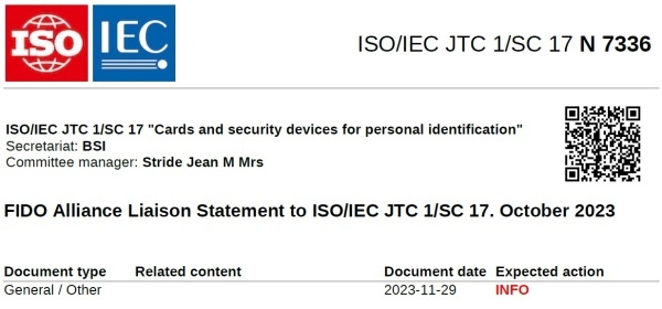 2023년 11월30일 ISO/IEC 공동기술위원회 산하 분과위원회 SC 17은 'FIDO Alliance Liaison Statement to ISO/IEC JTC 1/SC 17. October 2023' 문서를 배포했다.