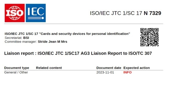 2023년 11월01일 ISO/IEC 공동기술위원회 산하 분과위원회 SC 17은 'Liaison report : ISO/IEC JTC 1/SC17 AG3 Liaison Report to ISO/TC 307' 관련된 문서를 배포했다.